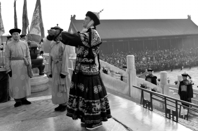 随着鼓乐声起,“皇帝”在“文武百官”的簇拥下缓步走向祈年殿前。此时,广场上旗罗伞盖飘展,刀枪剑戟生辉,128名乐舞生依次登场表演武功舞和文德舞,表现文治武功、天下太平的寓意。同时,20名歌工手执笏板登坛唱诵,“皇帝”在歌声舞影中向上天三次献酒,表达对风调雨顺、国泰民安的祈盼。