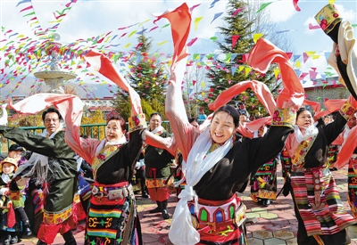 2月19日,拉萨西郊安居苑的藏族同胞欢聚在一起,载歌载舞,相互敬献“切玛”、敬献哈达,共同庆祝藏历新年。