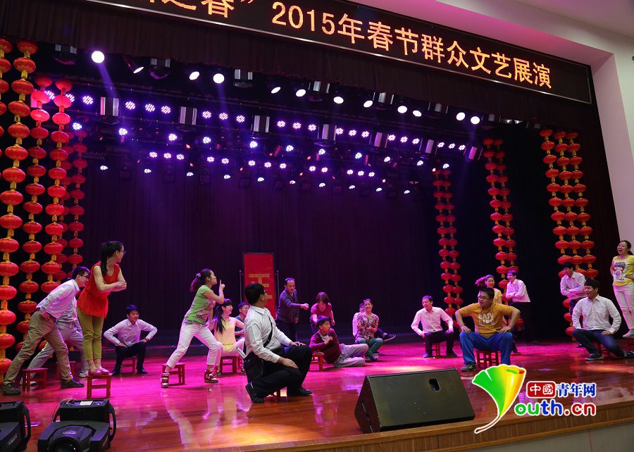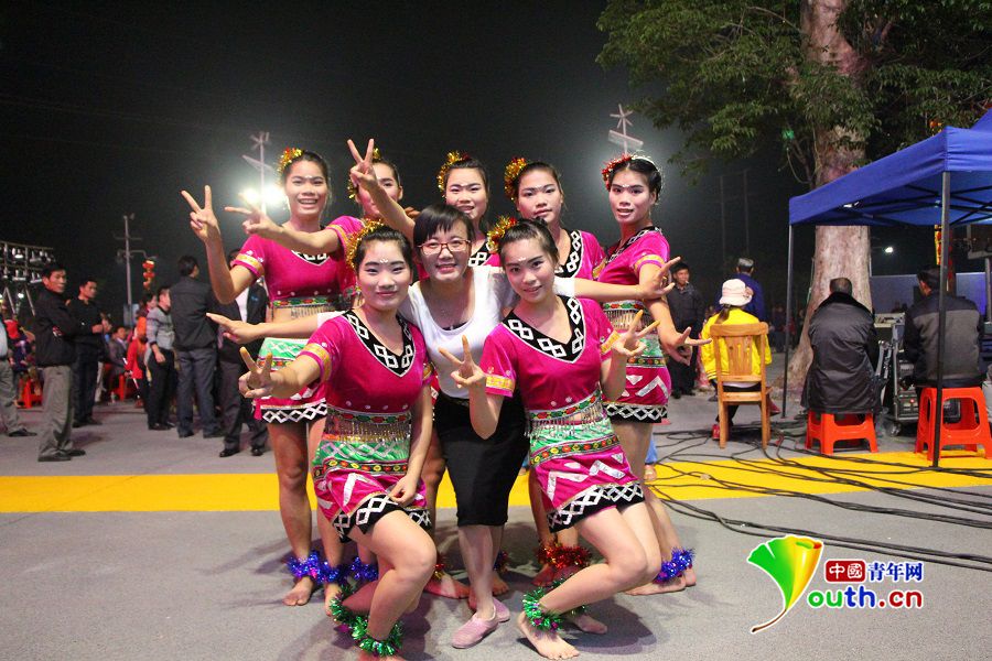 2月11日,海南省白沙县邦溪镇举办了2015年"美丽邦溪"春节联欢晚会。作为邦溪镇南班村大学生村官,李小嫚在筹备晚会时经常加班加点,与工作组一起完成了舞台设计、节目编排及舞台布置任务。图为李小嫚(中)在组织南班村返乡大学生编排舞蹈《黎家姑娘》时的合影。