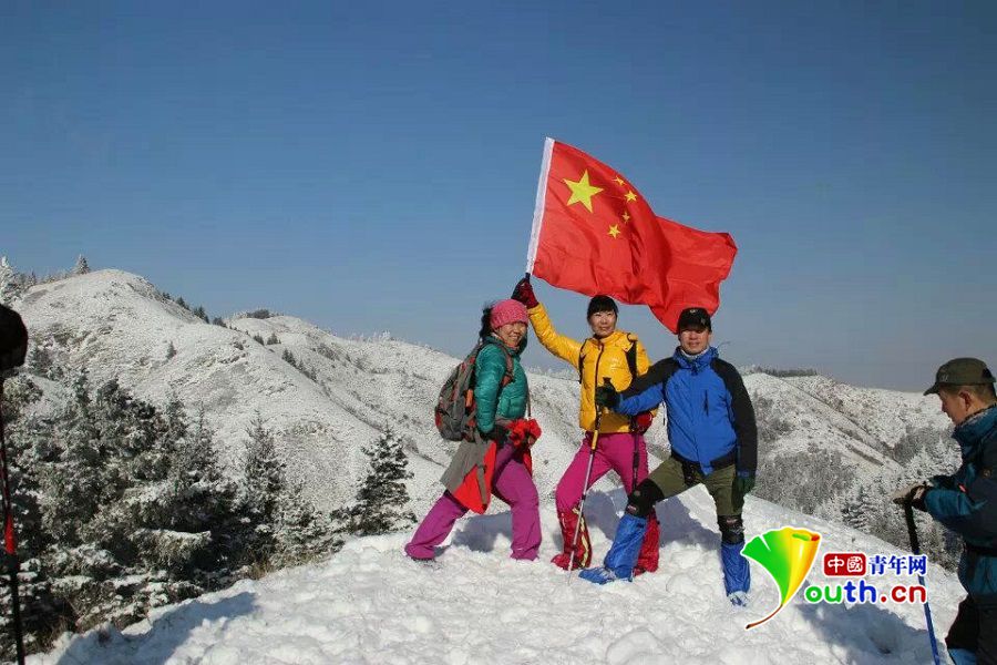 图为张爱花(中)与驴友在罗山上合影。