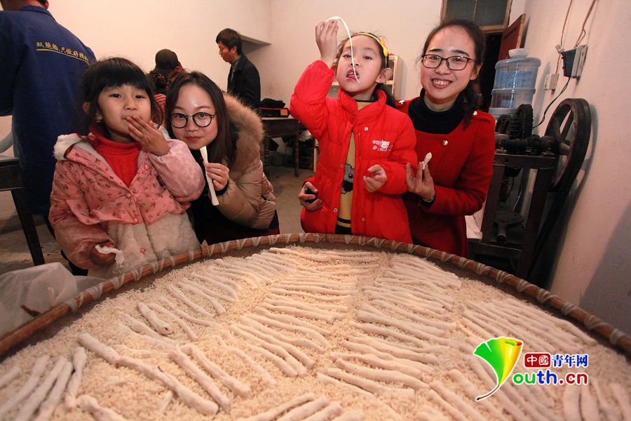 图为江西省东乡县大学生村官跟乡亲们学做传统手工米糖。