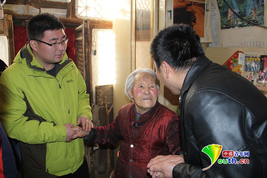 佳县方塌镇大学村官马剑(左一)春节慰问孤寡老人。