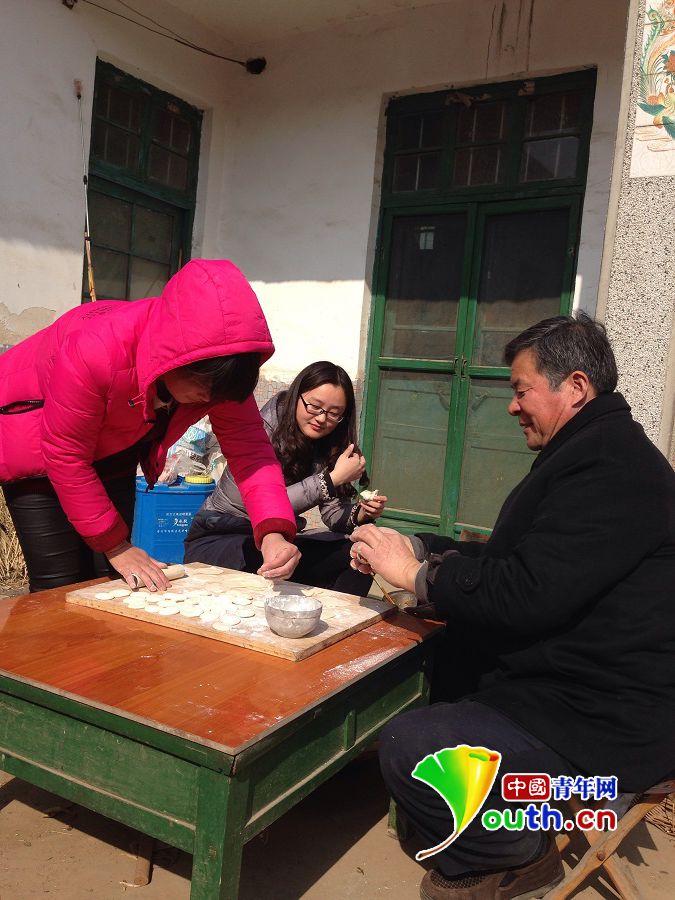 图为大学生村官孙丽在村民家里一起包饺子。
