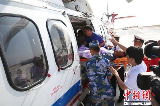 受伤渔民乘直升飞机回海南本岛治疗。 吴亚铁 摄