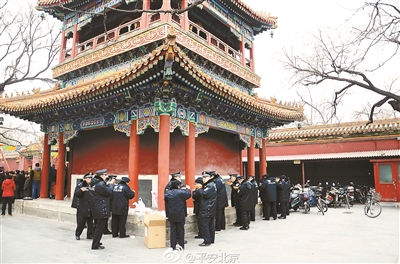 在发布这组图片的同时,发布者还写了一句话:“雍和宫,人潮拥挤的祈福队伍非常壮观,民警集体吃‘大餐’的场景更是壮观!”
