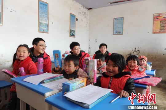 1月5日,三个合伙人来到甘肃贫困山区陇西汪家坡小学送去他们为孩子们购买的文体生活用品。 杨艳敏 摄