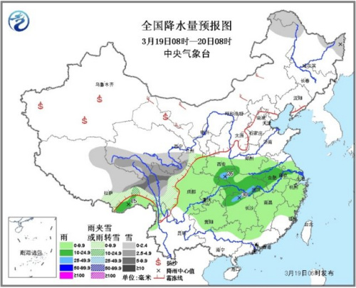 19日08时至20日08时,青海南部、西藏东部、川西高原中北部等地有小到中雪或雨夹雪,局地大雪;西北地区东南部、西南地区东部、黄淮西部、江汉、江淮、江南大部、华南北部等地有小到中雨,其中陕西东南部、湖北东南部、湖南西北部等地的部分地区有大雨,上述部分地区并伴有雷暴。新疆南疆盆地、甘肃西部等地有浮尘或扬沙,局地沙尘暴。内蒙古中西部等地的部分地区有4~6级风。