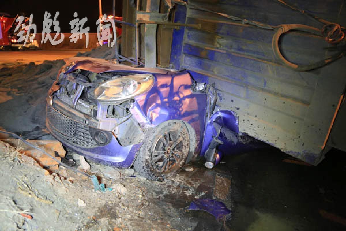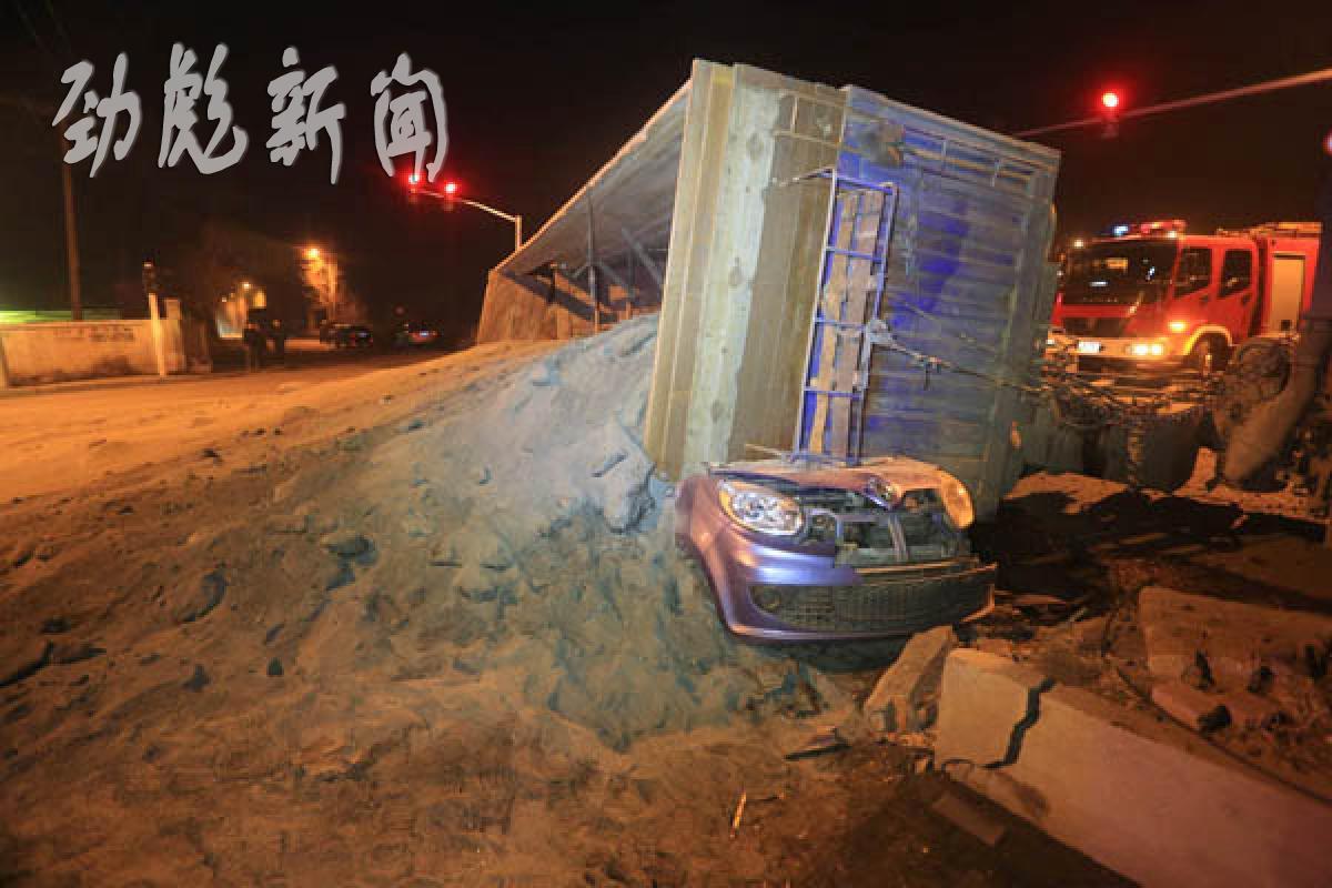 记者赶到现场看到,一辆拉运沙子的货车侧翻在路中,拉沙货车的车厢将一辆轿车砸在车下,将这辆轿车砸扁,只有前部分车体裸露在外,车上拉的沙子散落一地。