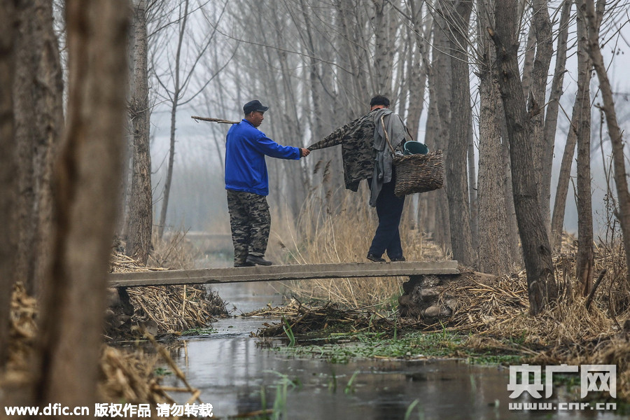 贾海霞和贾文其(左)在整理从树上砍下来的树枝,接下来就要涉水去荒滩栽种。