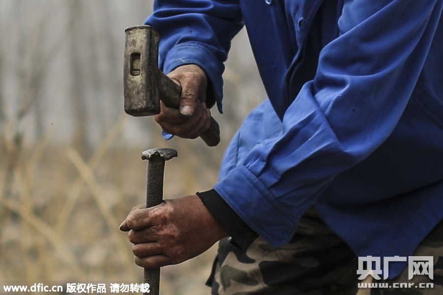 由于荒滩上全是石块,哥俩想出用钢筋打孔再种树的办法。由于双目失明,贾海霞只能凭感觉挥动铁锤,经常将自己左手砸破。