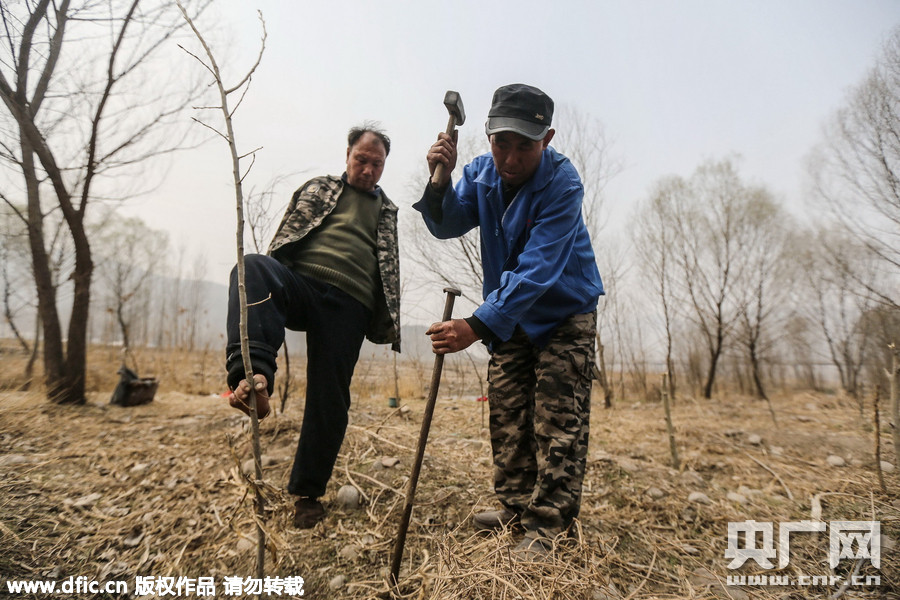 起初他们用铁锨挖坑,一铲下去,尽是石头,费时又费力。后来他们先用两指来粗的钢棍打眼,再将树枝插入其中,最后填土灌溉。