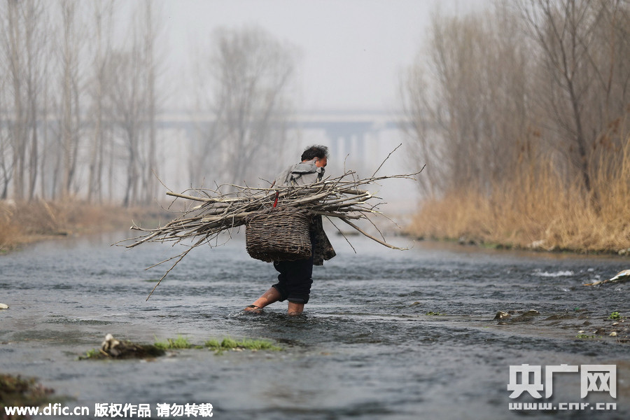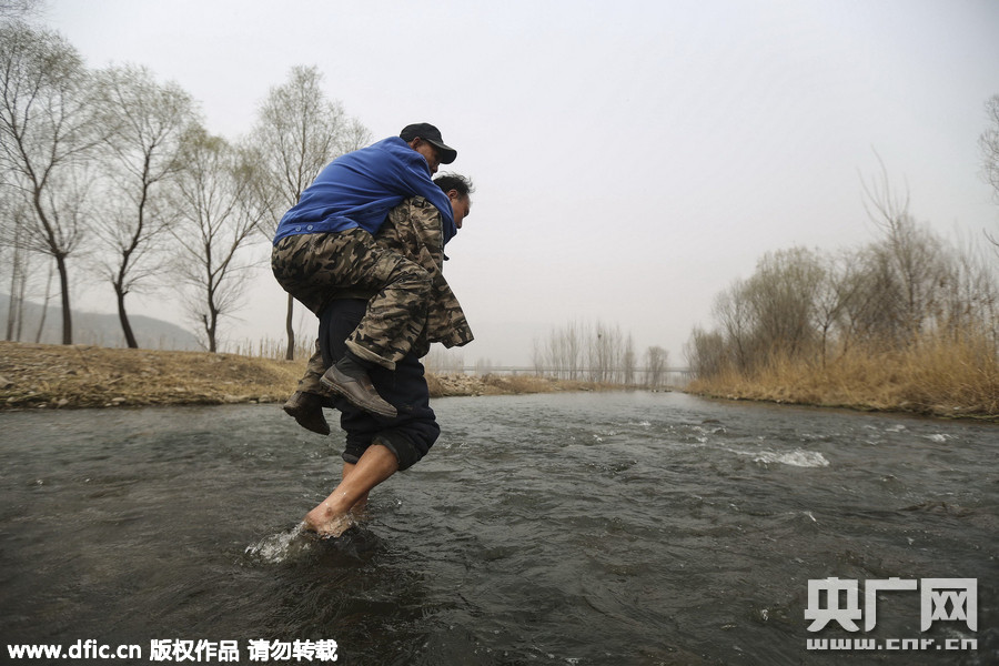 在涉水将树枝送上河滩之后,贾文其再回过来背失明的贾海霞过河。夏天的时候,湍急的水流会没过膝盖,而到了冬天,河水又冰冷刺骨。但这是他们过河的唯一方式。