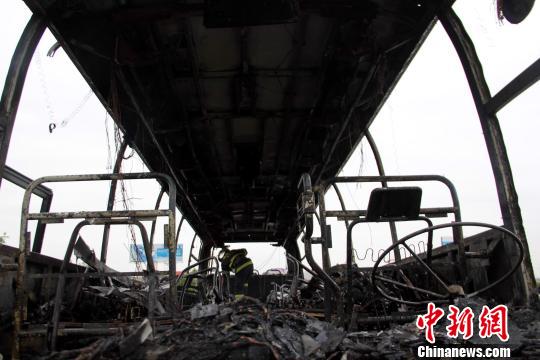 火灾过后,整辆客车几乎成了空架子,四个后轮全部被烧毁,只剩下钢丝,地上满是玻璃渣子,地上还散落着一些乘客的香烟等物品。