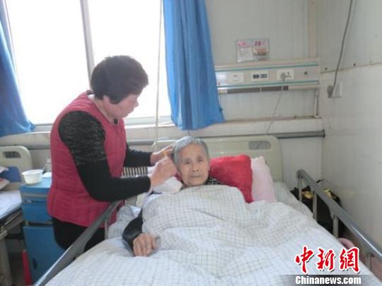 中新网徐州3月24日电(朱志庚 拾冠之)“婆婆自从生病卧床后大小便失禁,接小便可以用尿不湿、尿片,不过老人便秘严重,八年来,我就用手指给婆婆抠粪便。所以,在外人眼里,以为我只是保姆、护工、闺女,难能想到的是儿媳,并且又是养子媳妇。”3月24日,在徐州民政医院住院部四楼28床,68岁的吴彦美一边照顾着病床上的婆婆曹淑兰,一边心酸地说。