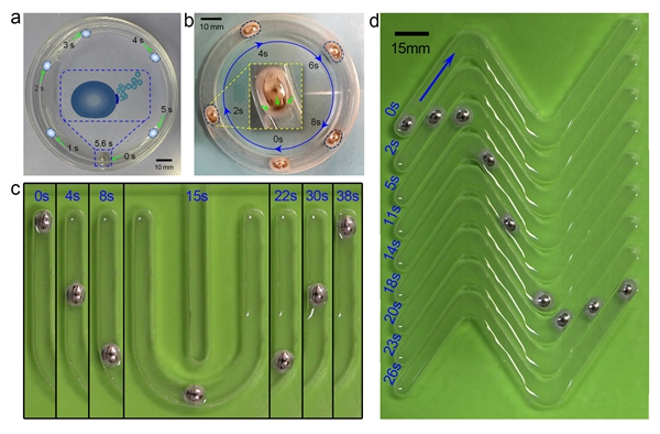 可变形液态金属机器在内含电解液的容器或各种槽道中的自主运动情形