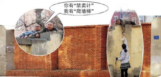 墙砌上了,通告也贴出了,但并没有阻挡住附近餐馆向学校院里送餐。送餐者爬上近3米高的大墙,继续将外卖送到学生手中。26日11时左右,记者在学校院里临近5号宿舍楼的大墙下站了20分钟,不时有送餐人员爬上墙头,将外卖递到墙下等候的学生手里。一名女生来取外卖,校方一中年男子对她说:“不是不让你们买了吗?你们导员没跟你们说吗?”女生说:“我钱都付了,这次就让我取了吧,以后不订了。”中年男子走后,三个保安模样的年轻男子又来到大墙下,其中一名男子说:“前一天我们看到晚上9点多,你们再送,我们就下岗了,你们别再为难我们了。”墙头上的送餐男子说:“就这一次,下次不送了。”