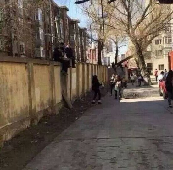 学生墙下等饭店爬墙送