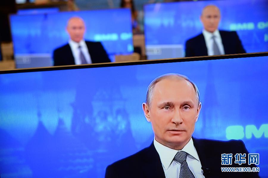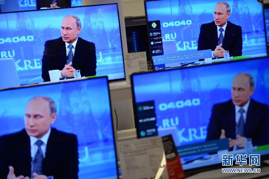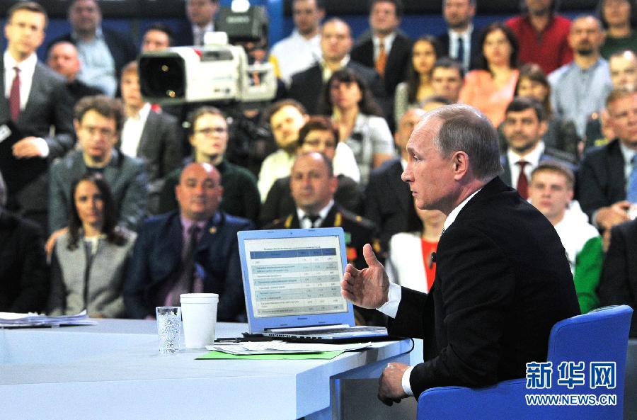 4月16日,在俄罗斯首都莫斯科,总统普京在连线交流后回答记者提问。当日,俄罗斯传统电视节目“与普京直接连线”在莫斯科进行,总统普京与民众展开长时间交流。 新华社记者贾宇辰摄