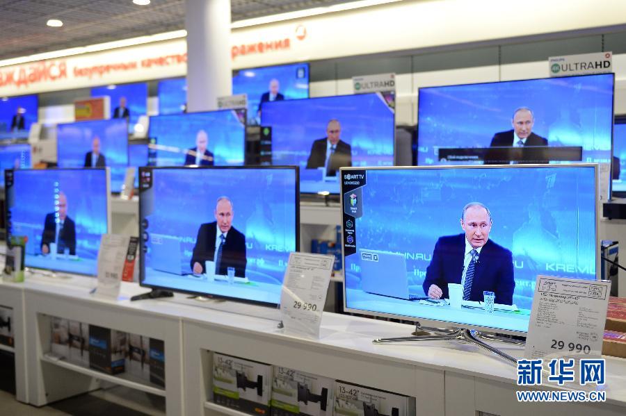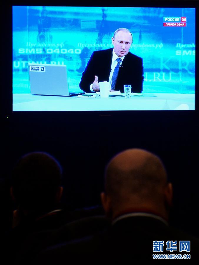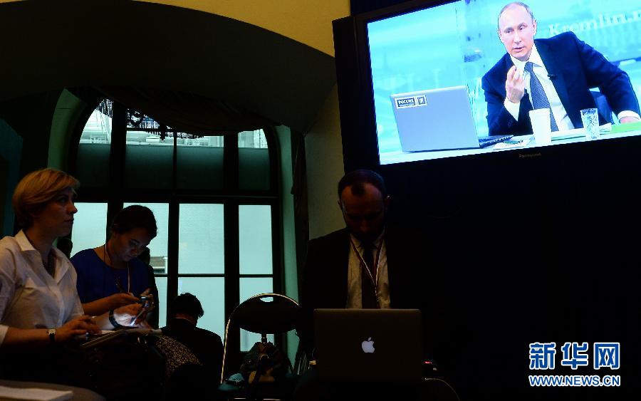 4月16日,在俄罗斯首都莫斯科,记者观看“与普京直接连线”节目。当日,俄罗斯传统电视节目“与普京直接连线”在莫斯科进行,总统普京与民众展开长时间交流。