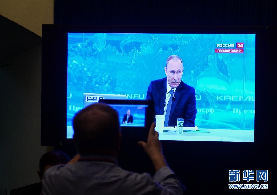 4月16日,在俄罗斯首都莫斯科,记者观看“与普京直接连线”节目。当日,俄罗斯传统电视节目“与普京直接连线”在莫斯科进行,总统普京与民众展开长时间交流。 新华社记者贾宇辰摄