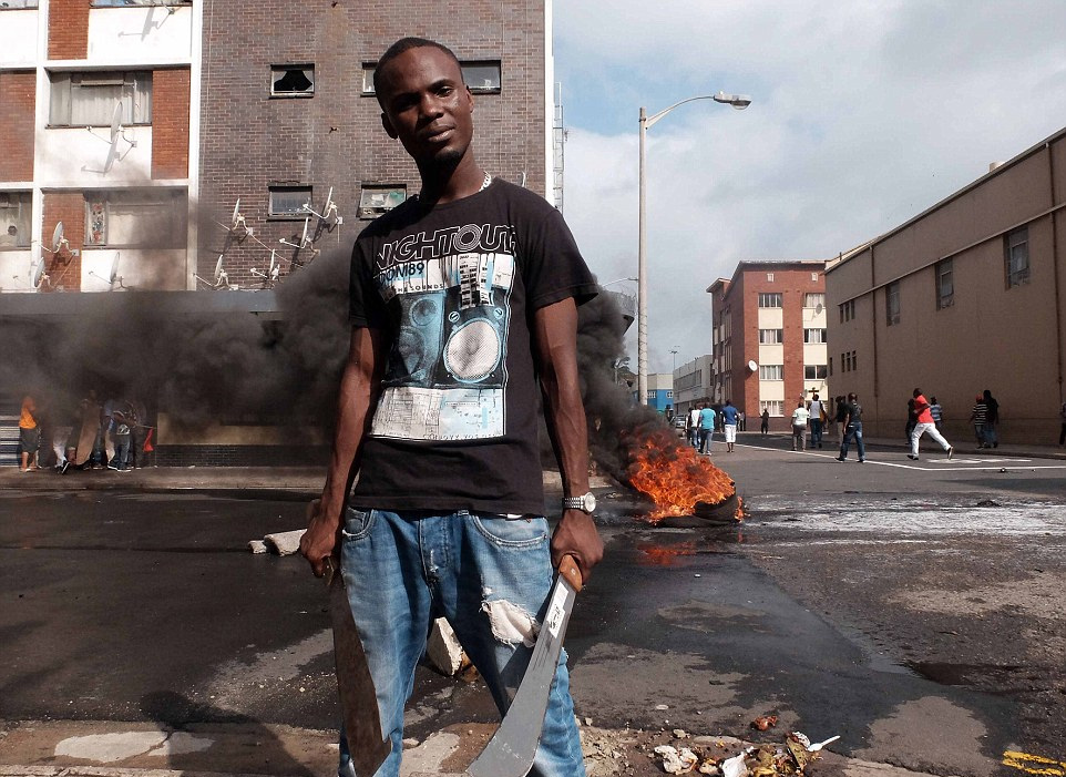 当地时间2015年4月14日,南非德班,外国人持刀自卫。据报道,南非针对外国人的暴力袭击和排外骚乱愈演愈烈,在南非多个城市蔓延,数百家外国人商店被打砸哄抢,数千名外国人流离失所。