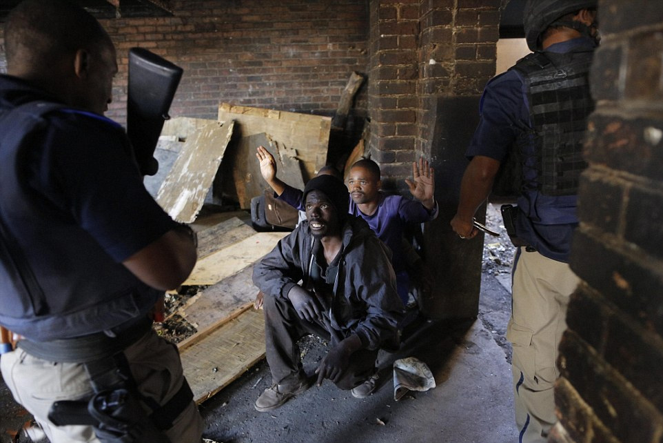 当地时间2015年4月16日,南非约翰内斯堡,警察用枪指着排外骚乱的嫌犯。据报道,南非针对外国人的暴力袭击和排外骚乱愈演愈烈,在南非多个城市蔓延,数百家外国人商店被打砸哄抢,数千名外国人流离失所。南非总统祖马发表电视讲话,呼吁南非民众立即停止针对外国人的暴力袭击。