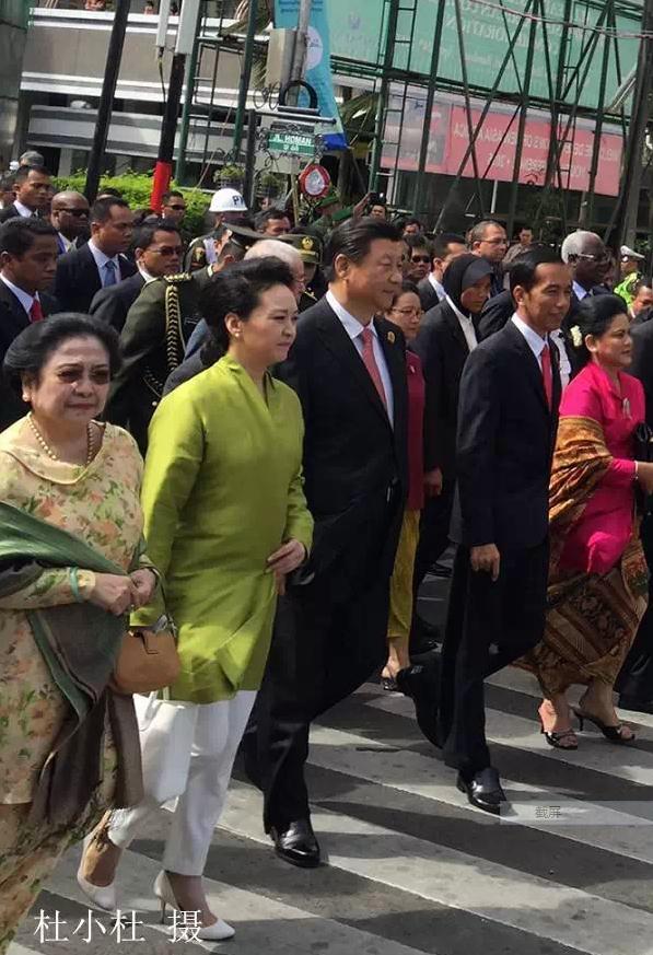 接着,领导人们健步走来。习主席、彭阿姨走在第一排,佐科夫妇右手边。挥手、微笑,风采卓然。