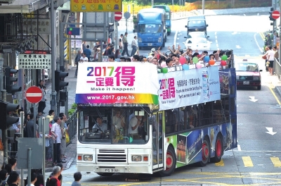 昨天下午,香港特区政府政务司司长林郑月娥、律政司司长袁国强和政制及内地事务局局长谭志源,联同约30名政治委任官员参与巴士巡游,向市民宣传普选方案,并争取市民的支持。