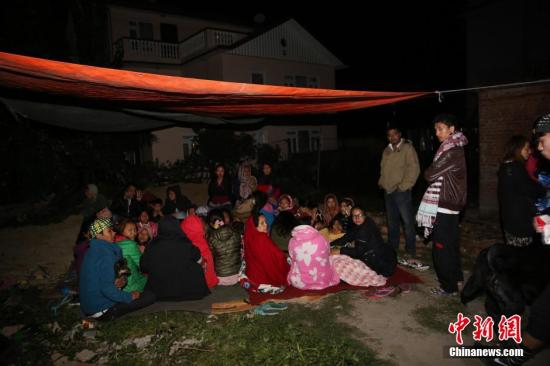 4月25日,尼泊尔发生里氏8.1级地震,首都加德满都大量房屋倒塌,部分道路堵塞中断。尼泊尔大部分地区不断发生余震,居民不敢进入室内生活。图为25日夜晚,加德满都民众在室外搭建临时帐篷过夜。 中新社发 符永康 摄