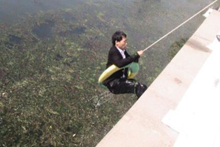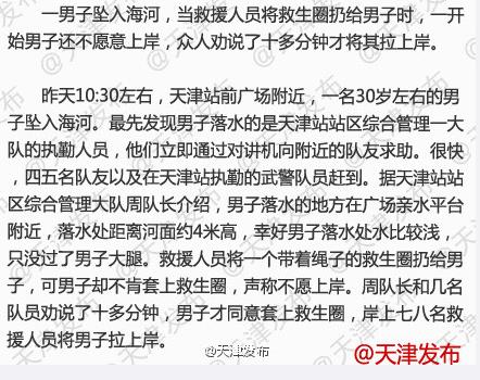 时刻新闻 —分享— 人民网北京4月27日电据天津市人民政府新闻办公室官方微博消息,昨天10点30半左右,天津站前广场附近,一名30岁左右的男子坠入海河。几名救援人员发现落水男子后,将一个带着绳子的救生圈扔给男子,可男子却不肯套上救生圈,声称不愿上岸。 经过十多分钟劝说,男子才同意套上救生圈,众人齐将男子拉上岸。 来源:人民网 编辑:高芹 实习生 罗雨晴