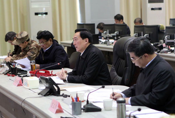 4月27日上午,自治区党委书记陈全国主持召开区党委常委扩大会议、自治区抗震救灾工作领导小组会议和指挥部联席会议,传达学习习近平总书记和李克强总理、俞正声主席等中央领导重要批示精神,进一步部署抗震救灾工作。姚海全 摄影报道