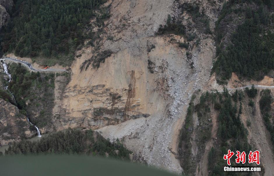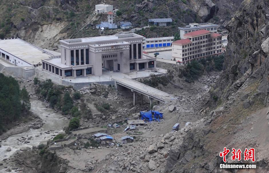 4月25日,尼泊尔发生8.1级地震,与尼泊尔毗邻的西藏自治区日喀则市吉隆镇震感强烈,造成人员伤亡和大量房屋受损,27日,西藏军区派出三架直升机向吉隆镇输送水、药品等物资。图为吉隆镇航拍图,可见部分房屋受损。中新社发 唐朝杨 摄