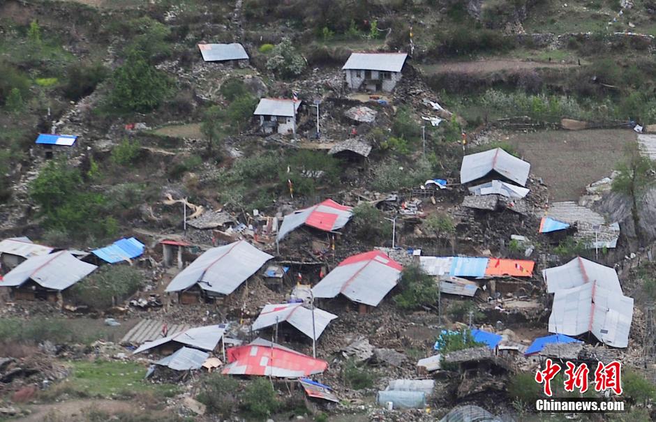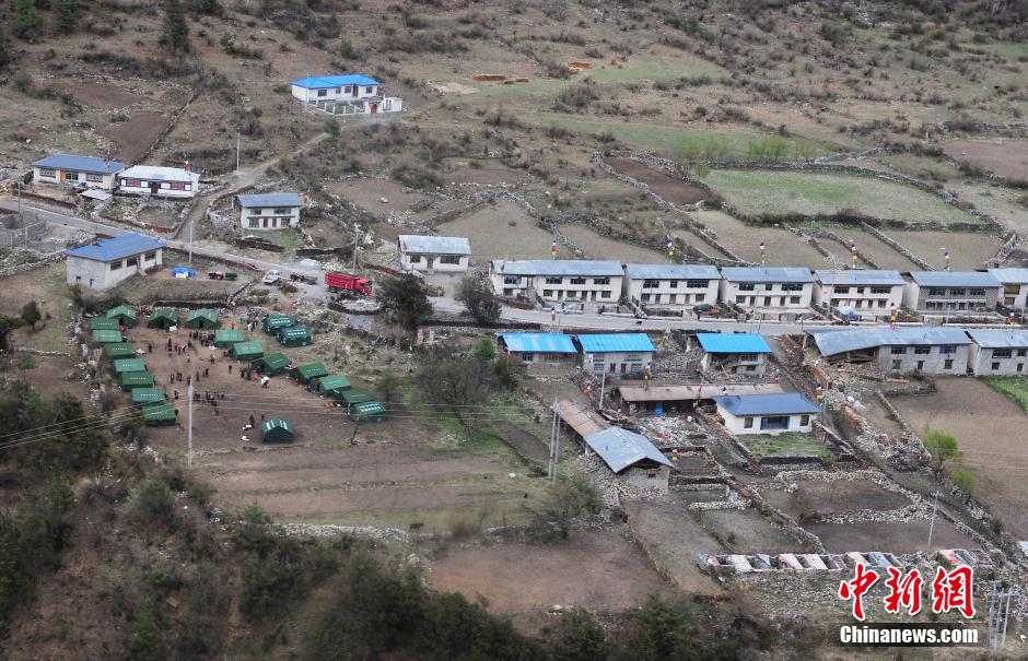 4月25日,尼泊尔发生8.1级地震,与尼泊尔毗邻的西藏自治区日喀则市吉隆镇震感强烈,造成人员伤亡和大量房屋受损,27日,西藏军区派出三架直升机向吉隆镇输送水、药品等物资。图为吉隆镇附近村庄的航拍图,可见部分房屋受损,民众在空地搭起了帐篷。中新社发 唐朝杨 摄