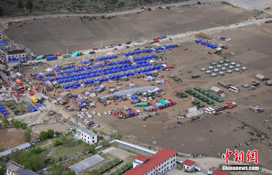 4月25日,尼泊尔发生8.1级地震,与尼泊尔毗邻的西藏自治区日喀则市吉隆镇震感强烈,造成人员伤亡和大量房屋受损,27日,西藏军区派出三架直升机向吉隆镇输送水、药品等物资。图为吉隆镇航拍图,可见空地上已搭起大量帐篷。中新社发 唐朝杨 摄
