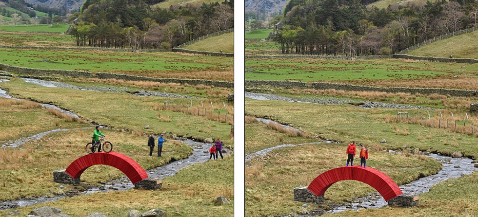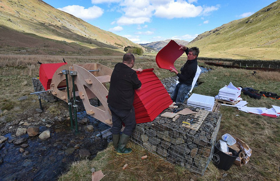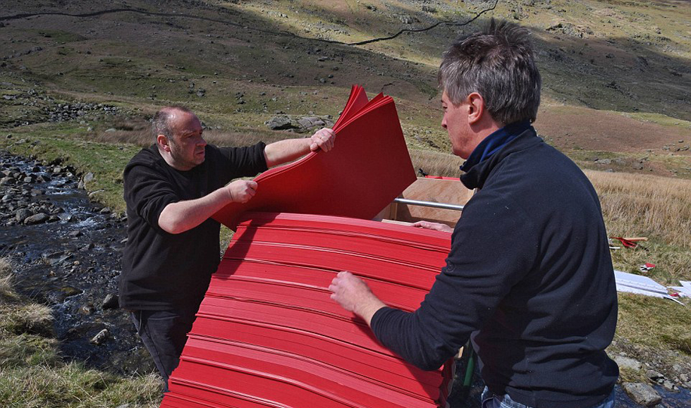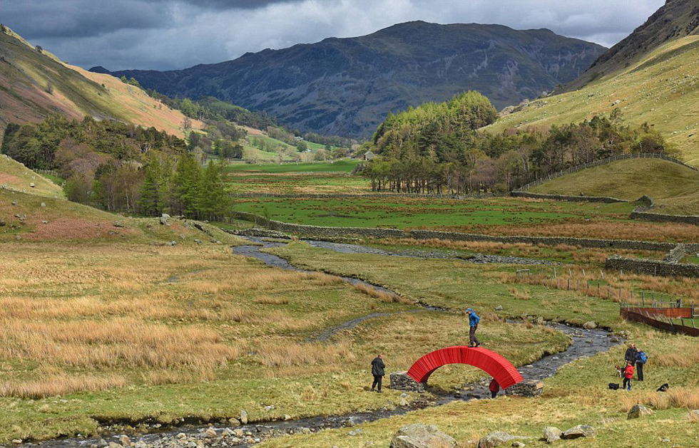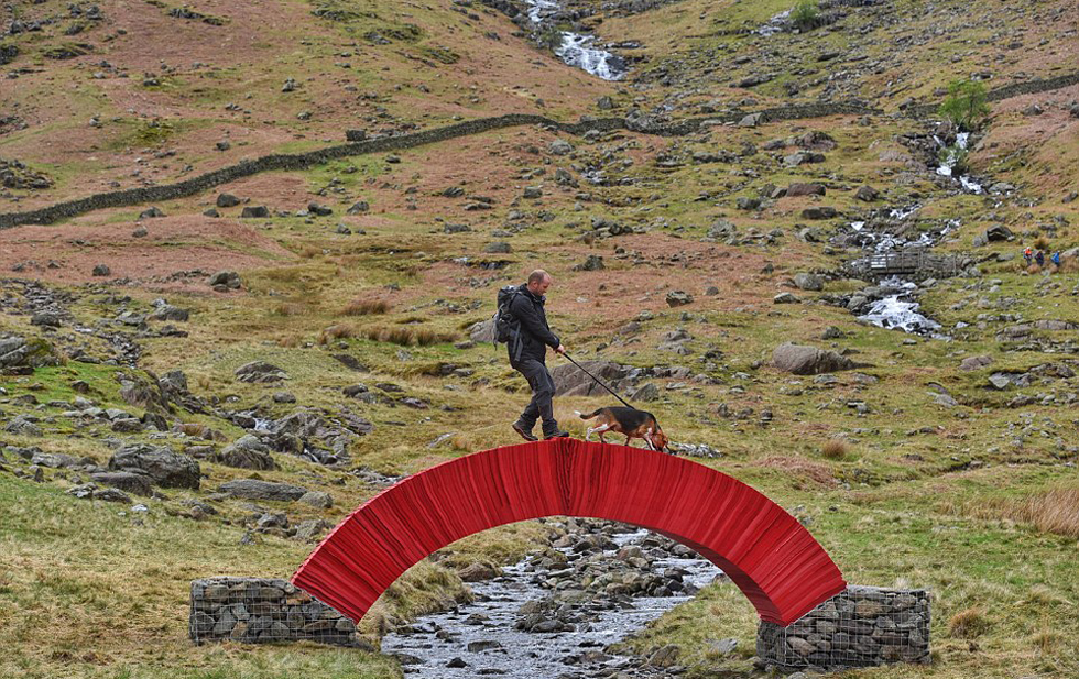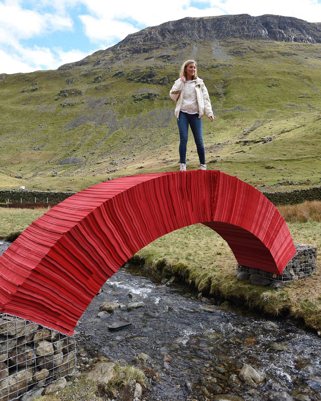 国际在线专稿:据英国《每日邮报》5月10日报道,英国环保艺术家史蒂夫·梅萨姆(Steve Messam)利用2.2万张红纸在坎布里亚郡赫尔韦林山(Helvellyn)的Grisedale峡谷,建造了长达5米的纸桥,而且没有使用胶水、螺栓以及其他固定支架支撑。