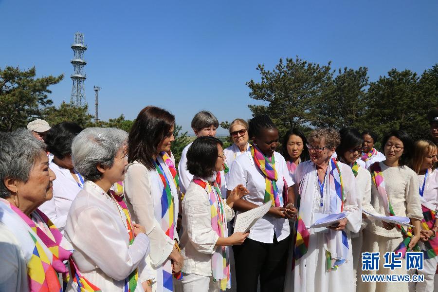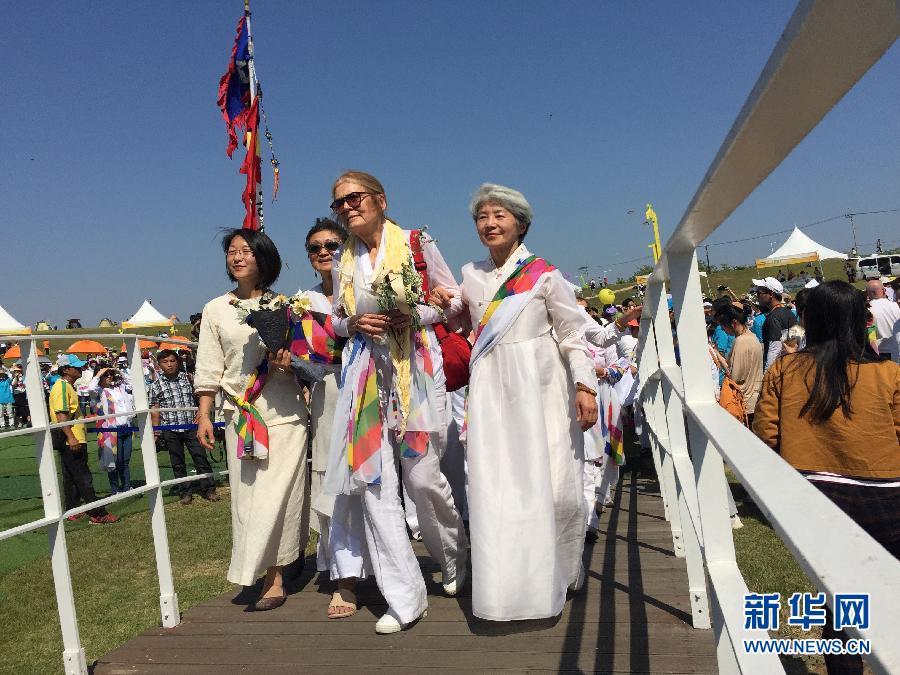 5月24日,代表团成员步行来到位于韩国京畿道坡州市的临津阁和平世界公园。由15个国家的30名女性活动家组成的“国际妇女大行进”代表团24日成功穿越朝韩非军事区从朝鲜进入韩国。她们希望用这种独特方式推动朝鲜半岛实现和平统一。新华社记者冮冶摄