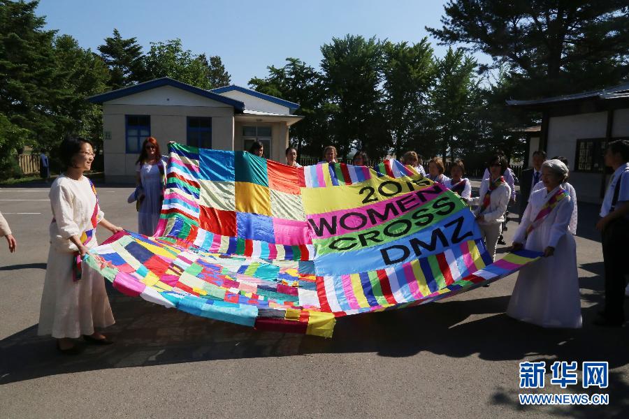 5月24日,在朝鲜开城,代表团成员展示写有“2015女性穿越非军事区”字样的彩色旗帜。由15个国家的30名女性活动家组成的“国际妇女大行进”代表团24日成功穿越朝韩非军事区从朝鲜进入韩国。她们希望用这种独特方式推动朝鲜半岛实现和平统一。新华社记者朱龙川摄