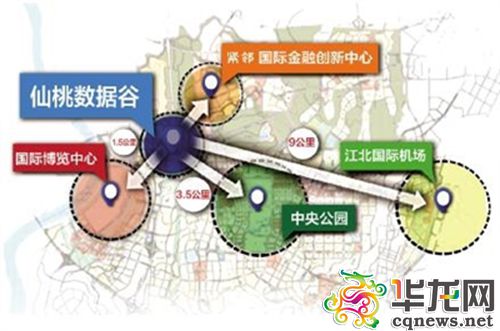 重庆仙桃数据谷与重庆国博中心和重庆中央公园形成了 “黄金三角”,紧邻规划中的国际金融创新中心,距江北国际机场仅9公里,并无缝连接“渝新欧”铁路延伸段。