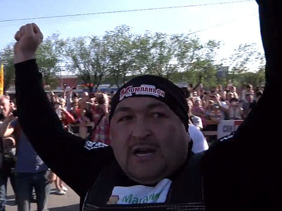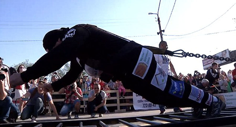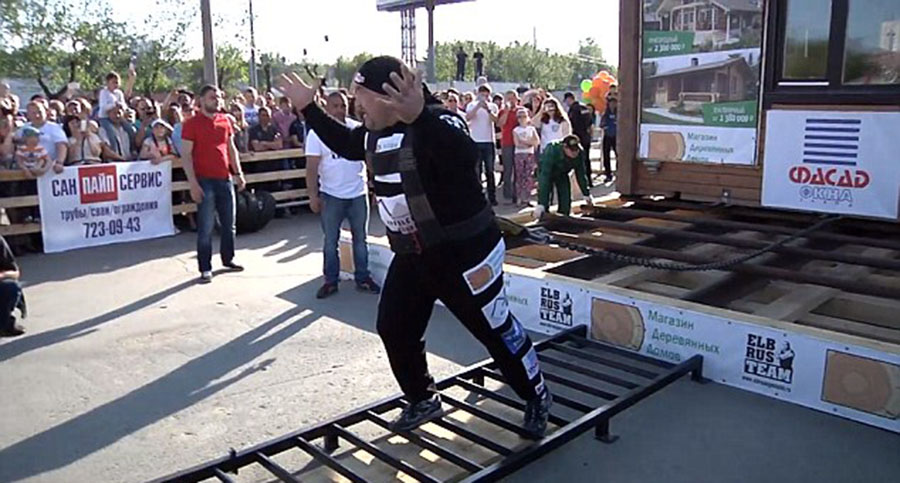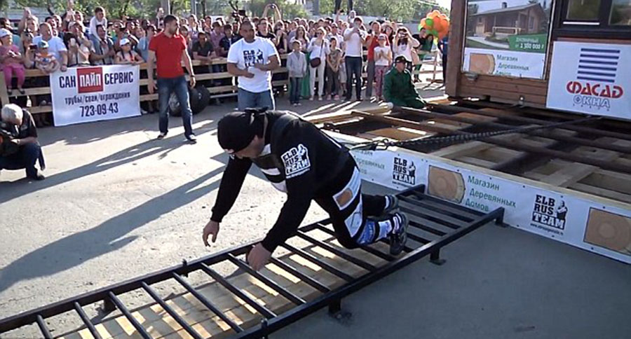 国际在线专稿:据英国《每日邮报》5月28日报道,来自俄罗斯乌拉尔山的大力士厄尔布鲁斯·尼格马图林(Elbrus Nigmatullin)日前在车里雅宾斯克(Chelyabinsk)将重达30吨的两层木屋拖出3米远,成功打破世界纪录。