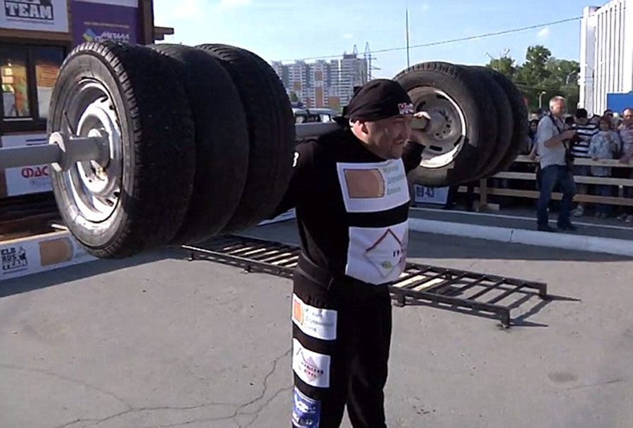 俄罗斯大力士尼格马图林蹲举6个沉重的轮胎热身,准备挑战世界纪录(网页截图)