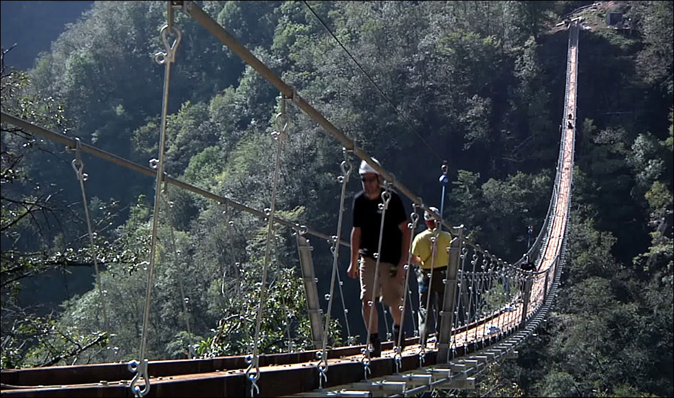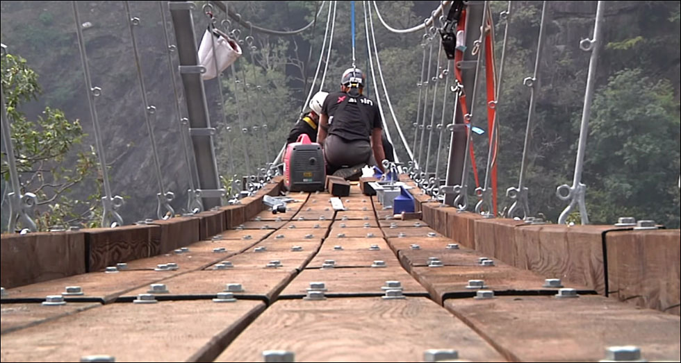 别看这桥又长又窄,大风一来摇摇欲坠的样子,其安全措施可一点都不马虎。工人们以厚重的实木打造空中步道,两侧也都有密实的防护网,高强度的刺激体验,为当地观光注入生机。
