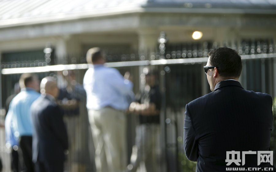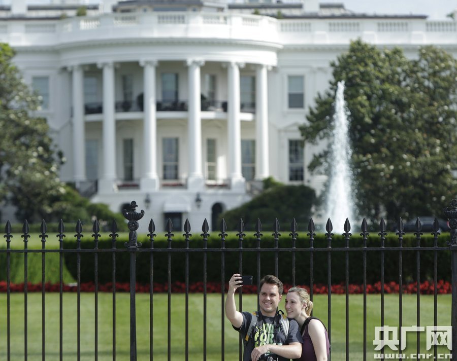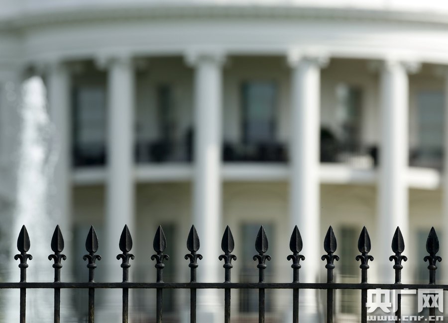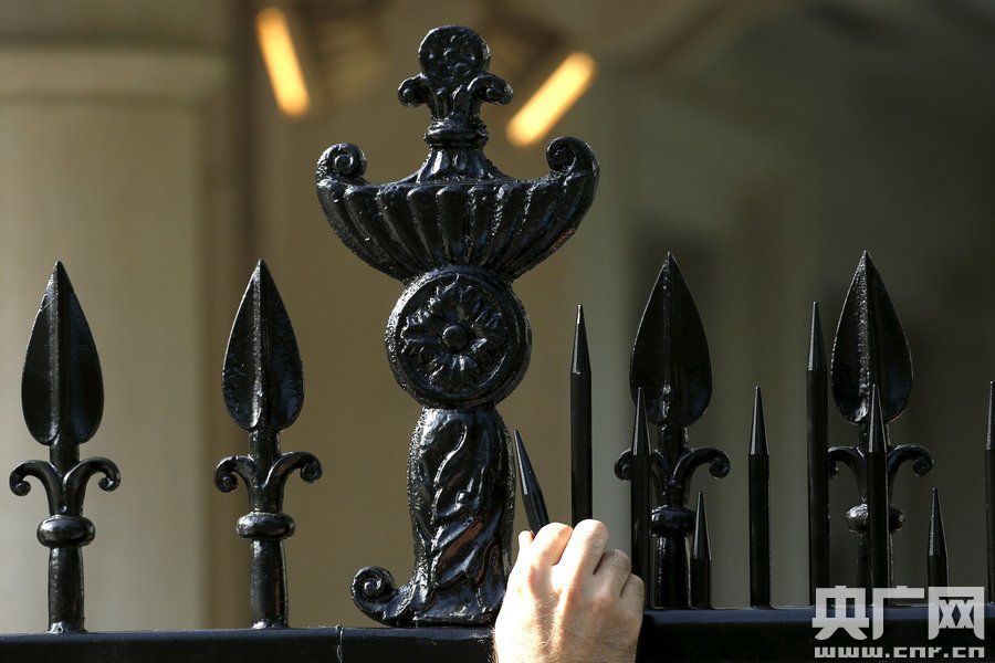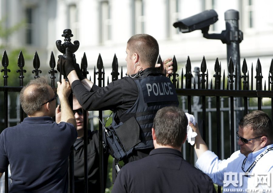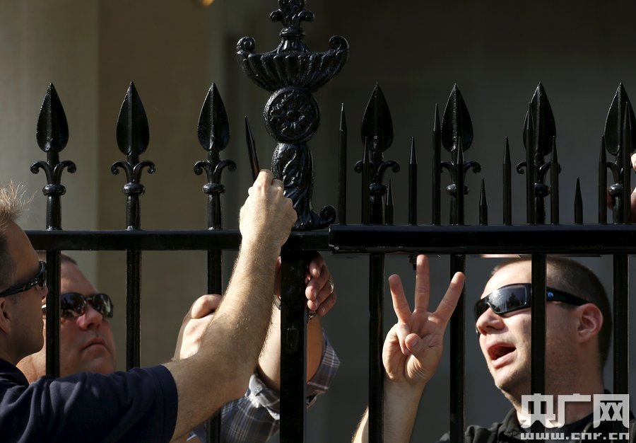 当地时间2015年5月28日,美国华盛顿,特勤人员在白宫栅栏上加装带刺钢钉。钢刺长18厘米,顶端的尖头长1厘米,向外突出几英寸呈锐角。这些钢刺将在现有尖头铁护栏的基础上形成第二层保护。在此之前,白宫发生了一系列翻越护栏的安全事件。