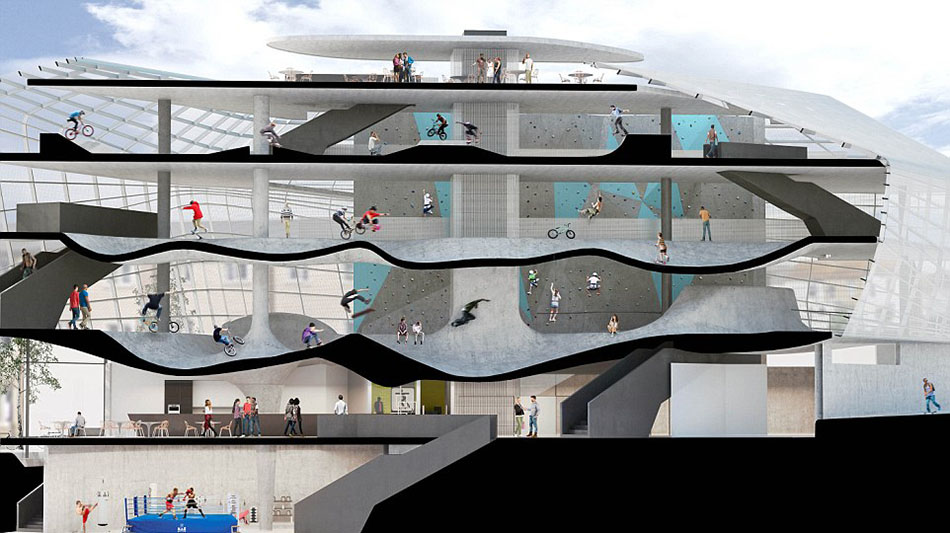 除了滑板、小轮车外,这栋建筑中还有11米高的攀岩墙以及宽敞的屋顶露台(网页截图)