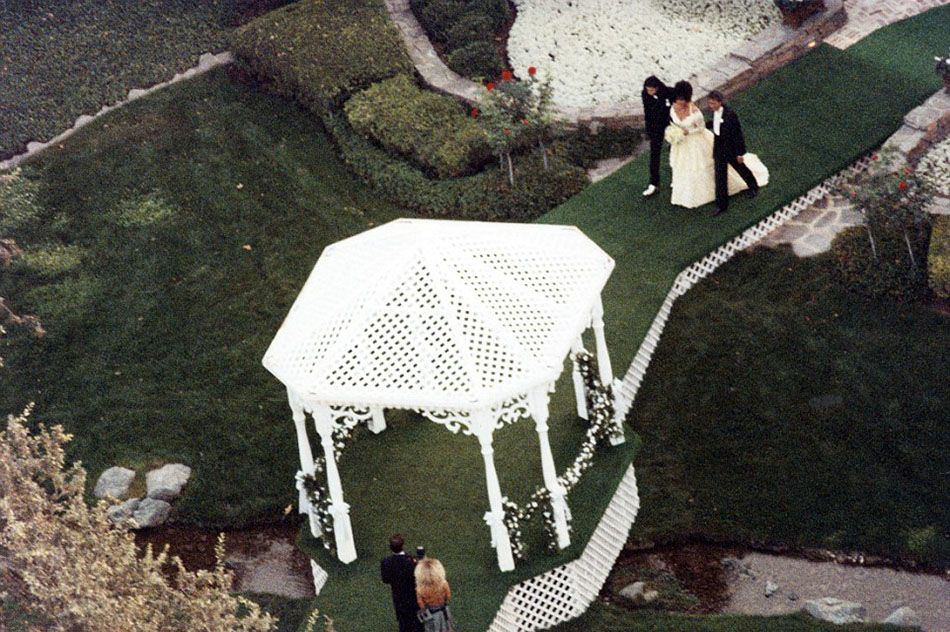1991年,在杰克逊和儿子迈克尔·怀尔丁(Michael Wilding Jr)的陪伴下,伊丽莎白·泰勒(Elizabeth Taylor)走上露台,嫁给了第八任、也是最后一任丈夫拉里(Larry Fortensky)(网页截图)