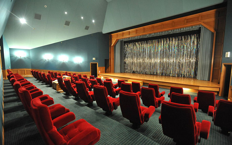 家庭影院中拥有红色天鹅绒椅子和木质舞台(网页截图)