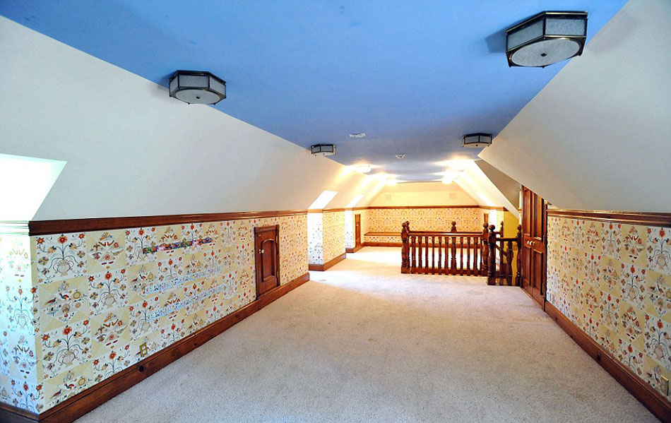 主屋中的二层房间,天蓝色的天花板,地板上铺有毛毯,墙壁上刻有图案(网页截图)