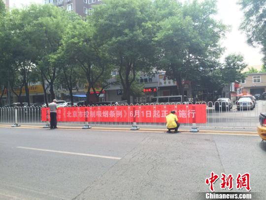 6月1日起,被称为“史上最严”的《北京市控制吸烟条例》将正式施行。图为5月29日,两名工人在北京海淀区街头设置控烟提示横幅。中新网记者 阚枫 摄