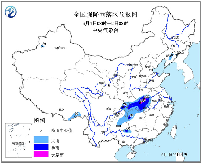 6月1日08时至6月2日08时,西藏东南部、辽宁东部、吉林东南部、西南地区东部、黄淮南部、江汉、江淮西部、湖南北部、广西北部、广东北部等地有中到大雨,其中,重庆北部、湖北东部和西部、河南南部等地的部分地区有暴雨,局地大暴雨;上述局部地区还将伴有雷暴、短时强降水等强对流天气。