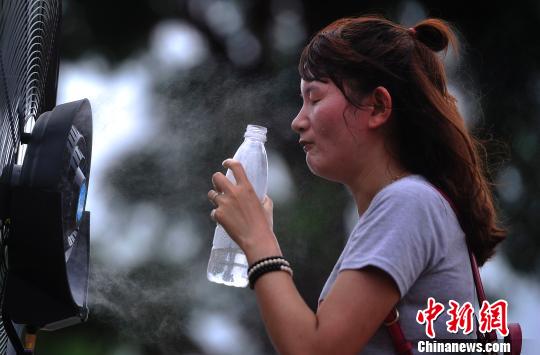 6月27日,一女士正面对着喷有水雾的电风扇喝水纳凉。当日,重庆市气象台发布“高温橙色预警”信号,预计该市渝中、大渡口、江北、九龙坡、南岸、万州、云阳、开县、南川、綦江等区县日最高气温将升至37℃以上。