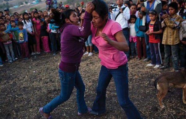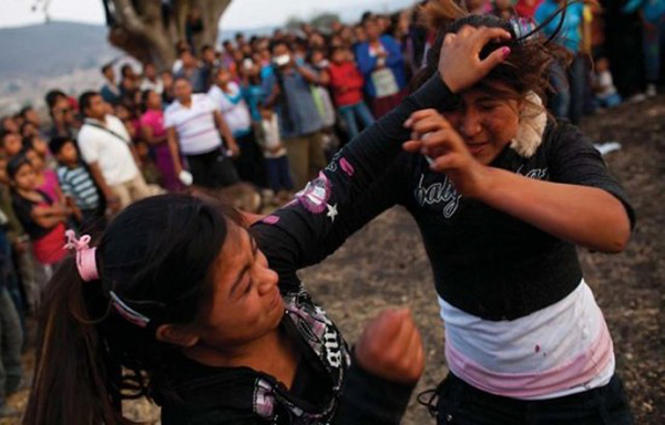 国际在线专稿:据英国《每日邮报》6月28日报道,每年5月份,墨西哥格雷罗州(Guerrero)Nahua村的女性都会举行打斗比赛,直至将对手打至半死。比赛中流出的血液将被收集到桶中,随后浇灌土地。村民们认为,这种怪异仪式将会带来雨水,让他们获得大丰收。
